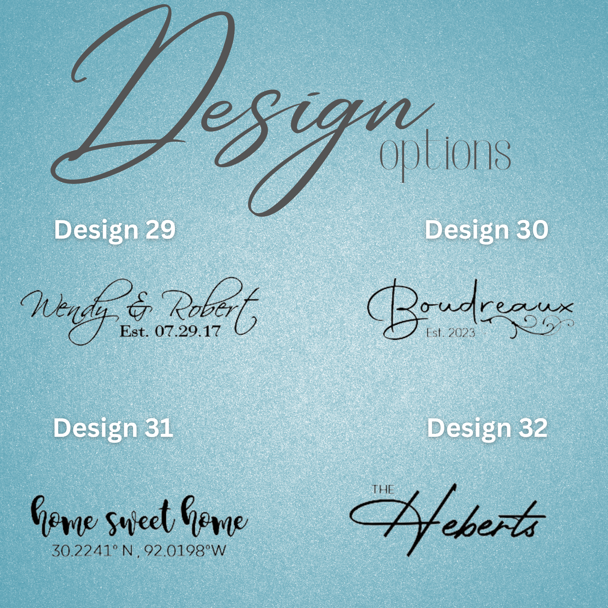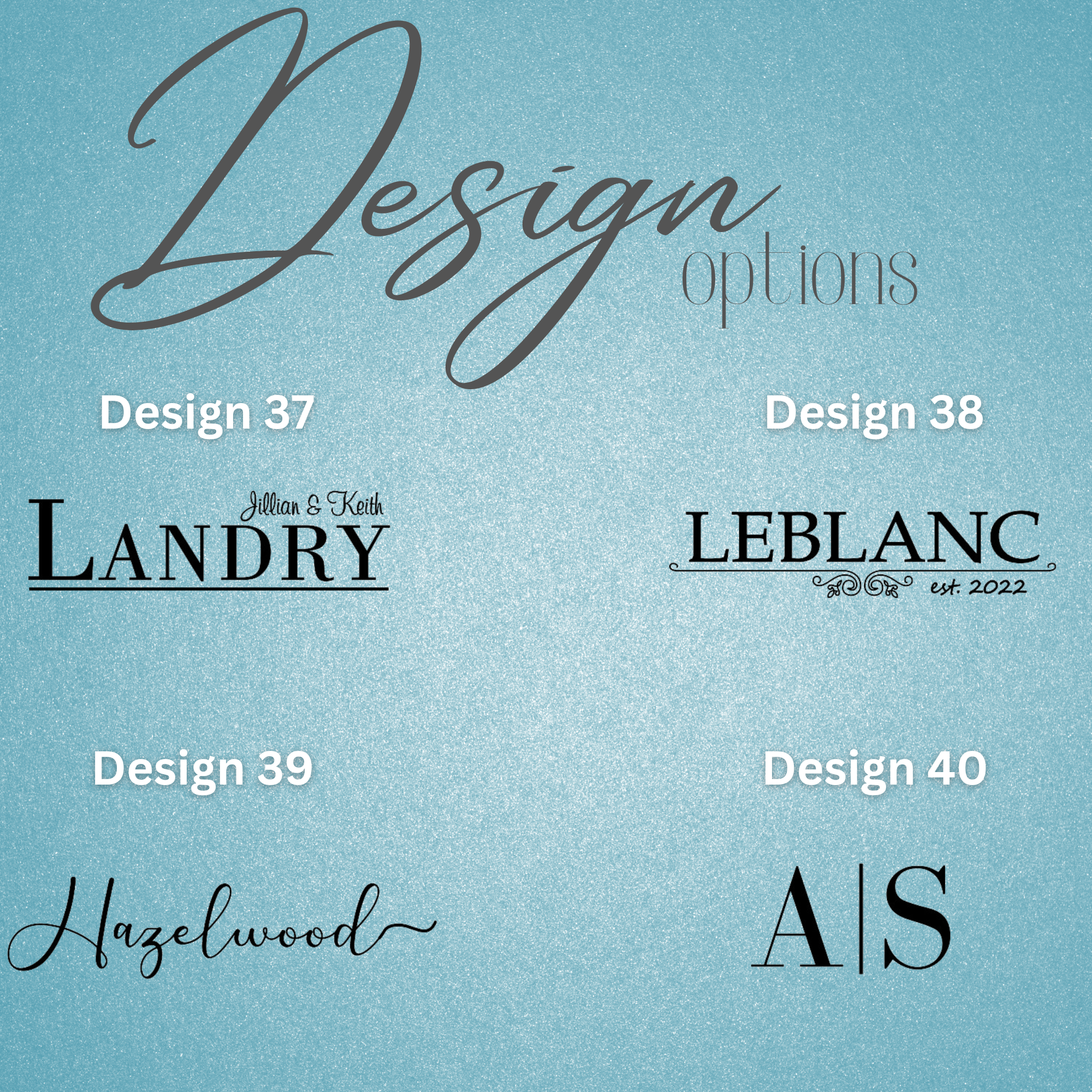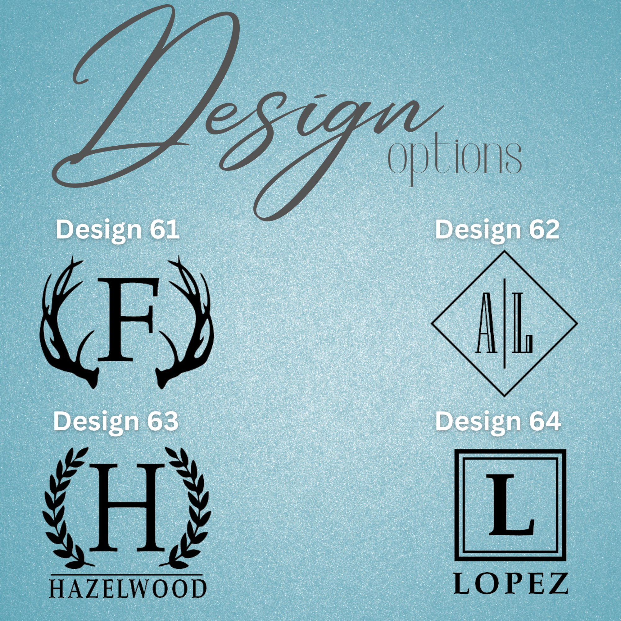Choose from any of the font, monogram or premade design options listed and include your choice information in the personalization field when making your selections.