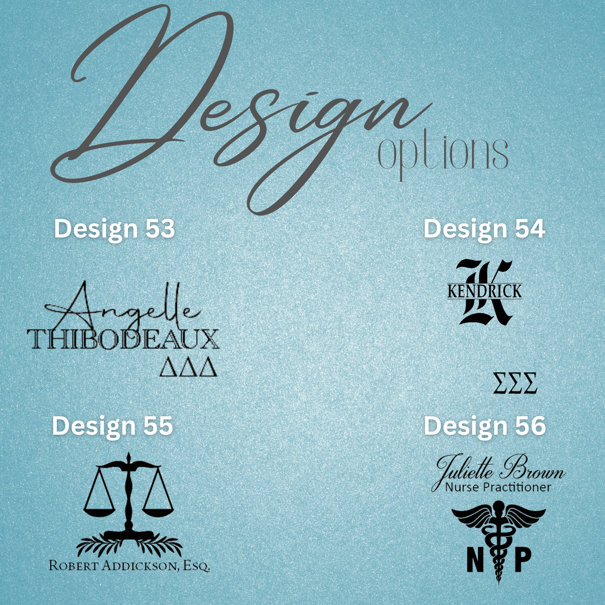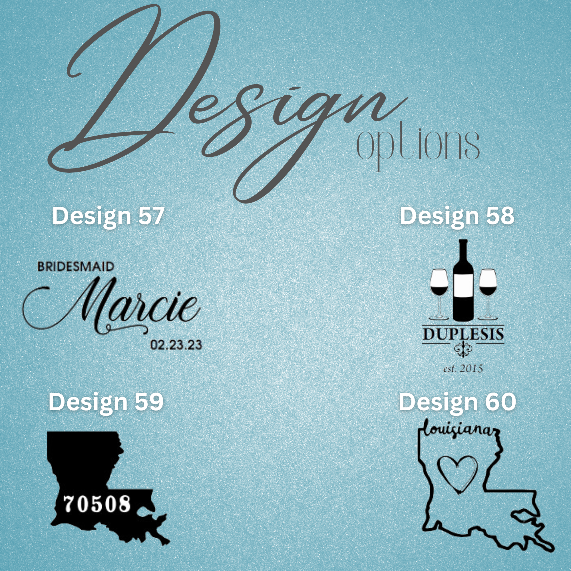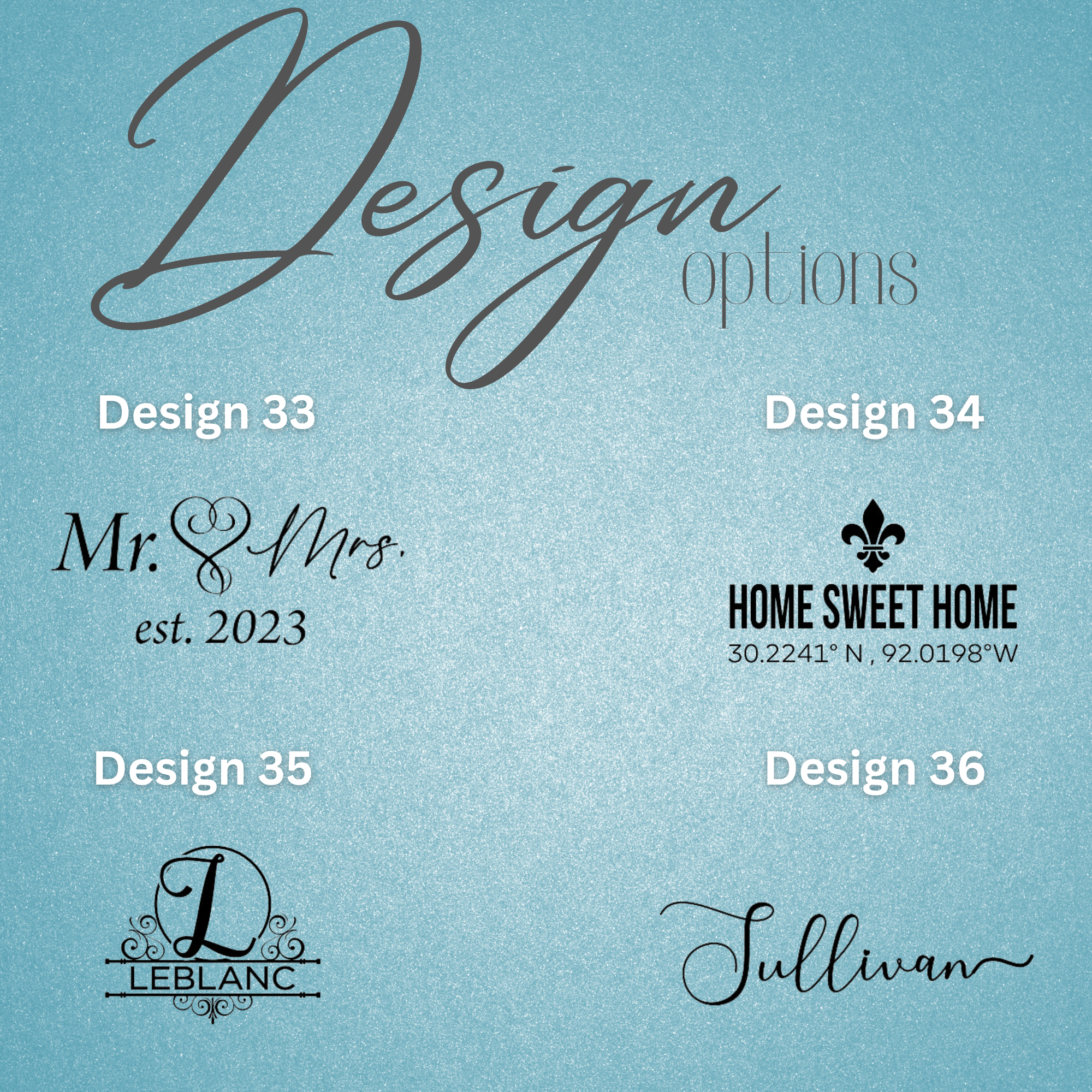 Choose from any of the font, monogram or premade design options listed and include your choice information in the personalization field when making your selections.