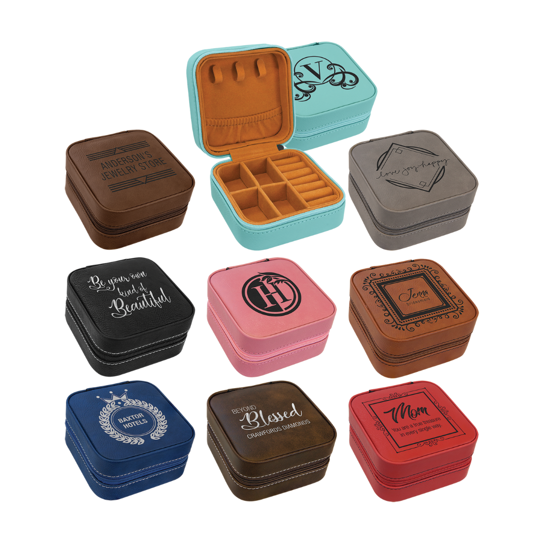 Leatherette travel jewelry boxes are compact for your suitcase or purse. Inside of box are compartments for chains, rings, earrings, or whatever jewelry you want to bring along. Personalized they make a perfect custom gift for any occasion.